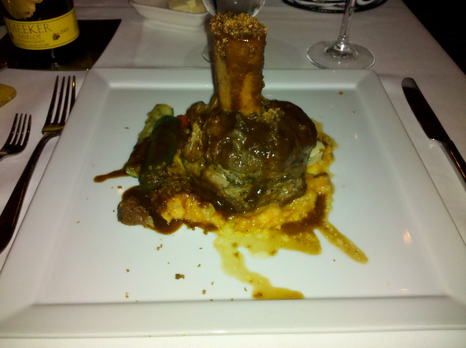 With the pleasantries of the appetizer and salad out of the way, it was time for the the main course. I decided to follow our server's suggestion, and went with the braised veal shank, which was paired with a potato-carrot puree. I had seen a few of this dish leave the kitchen, and I knew I was in for a treat. This thought was confirmed when our server brought a small seafood fork, which he said was to be used for extracting the marrow.
